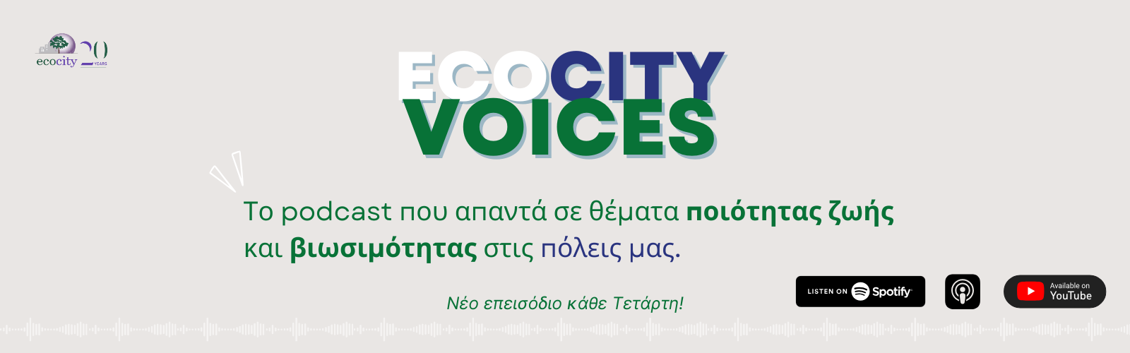 Το ECOCITY Voices, το νέο podcast του οργανισμού ECOCITY, φέρνει στο προσκήνιο έναν ανοιχτό διάλογο για τη βιωσιμότητα, τη δημόσια υγεία και τη σύγχρονη πόλη. Με ήδη 17 επεισόδια στον αέρα, η σειρά φιλοξενεί διακεκριμένους επιστήμονες, ερευνητές και επαγγελματίες που μοιράζονται γνώσεις, εμπειρίες και πρακτικές ιδέες για έναν πιο υπεύθυνο και βιώσιμο τρόπο ζωής.